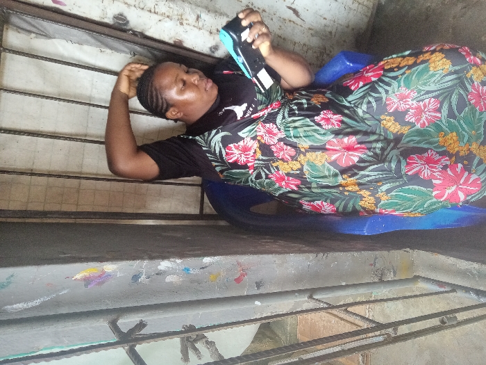 An adult female is seated on a blue plastic chair in an interior or semi-enclosed urban setting in the city of Aba, Abia State, Nigeria