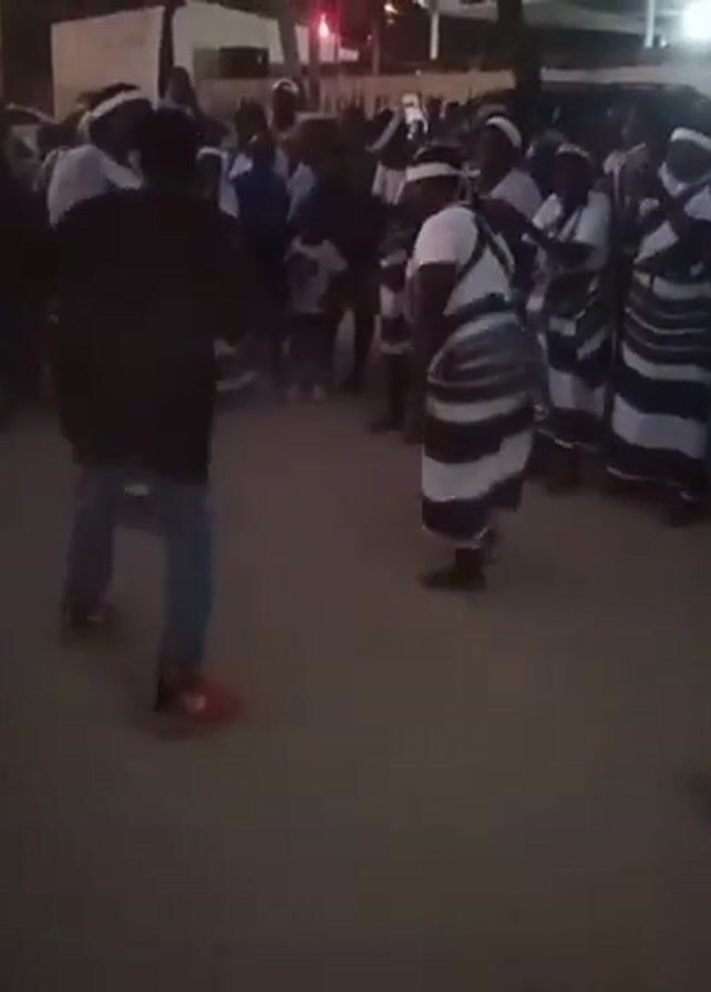 group of people gathered outdoors, seemingly in a street or parking lot, at dusk or night. Most of the group consists of women dressed in similar traditional outfits consisting of white shirts and striped skirts. They are standing in a circle and clapping their hands rhythmically. In the center of the circle, one of the women is actively dancing, while another person, dressed in jeans and a dark jacket, is also dancing near the dancer. The lighting is dim, making details difficult to discern, but there are buildings and cars visible in the background. There is a small object, possibly a bowl or hat, on the ground near the center of the circle. The overall impression is that of a cultural dance or performance taking place in a public space.