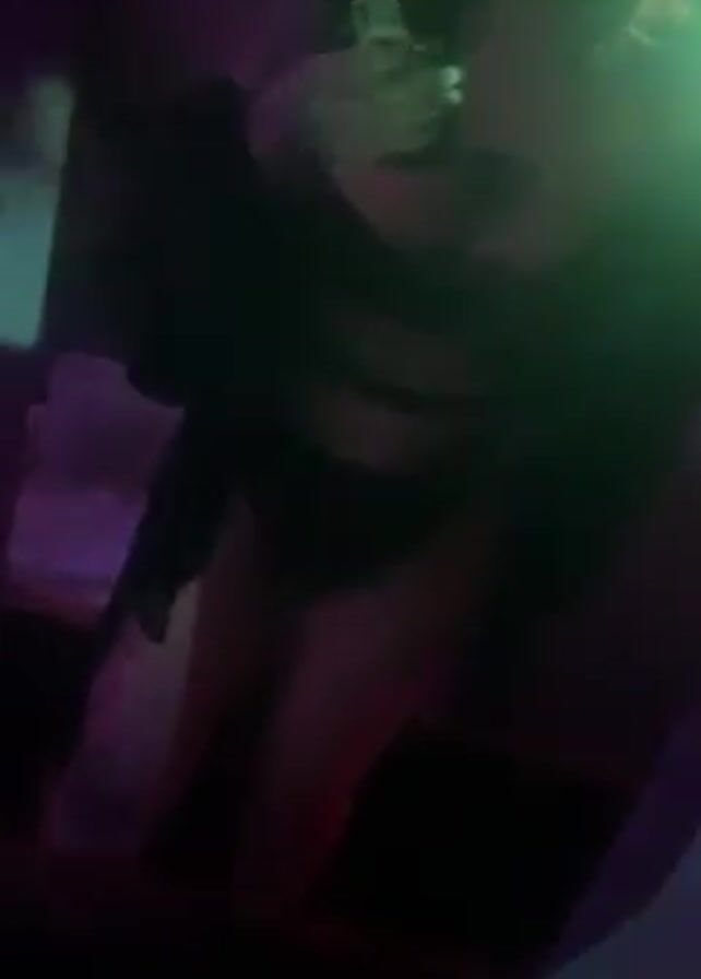 person taking a selfie in a mirror. The person appears to be wearing black lingerie with straps and a black blazer. There are tattoos visible on one of their legs. The room is dimly lit with a pink and green hue, and a bed is visible in the background. The person is holding a phone and appears to be posing for the camera.