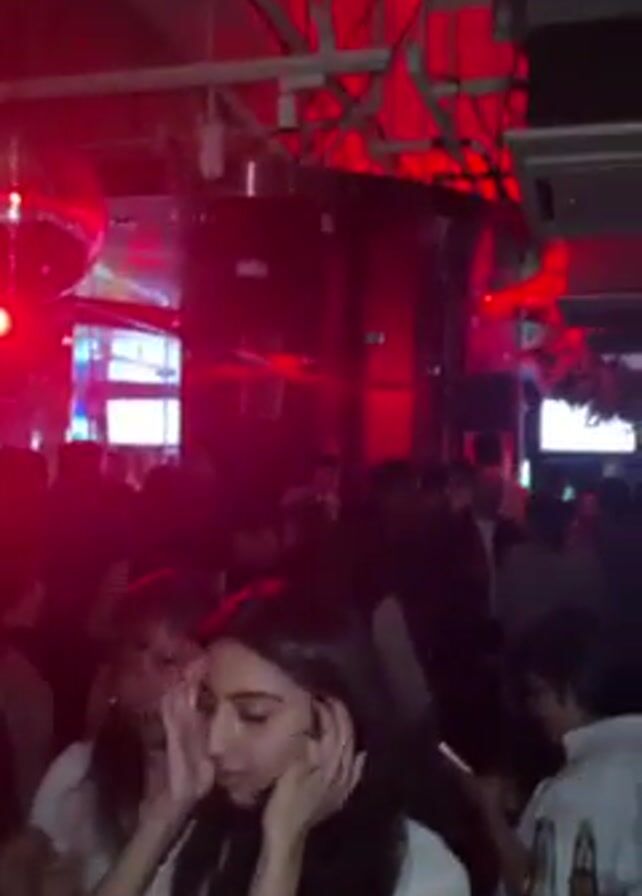 crowded nightclub bathed in red light. People are dancing and socializing, several making peace signs to the camera. A disco ball hangs from the ceiling, reflecting light. Speakers and other equipment are visible in the ceiling.