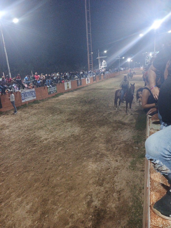 A crowd of people overlooks a rodeo arena with an orange barrier. One rider on horseback is in the center, while another is farther down the arena. The ground is dirt and lit up by overhead lights. There are tall structures in the background. People sitting on the edge of the barrier are visible in the foreground.