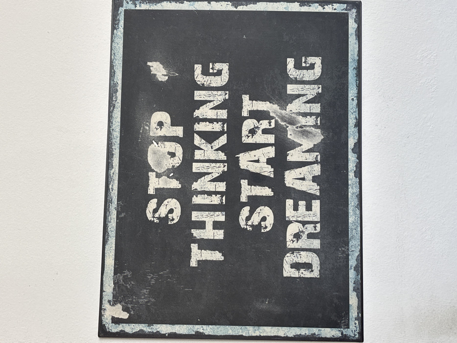 A rectangular, weathered motivational sign is affixed to a plain white wall. The sign features a dark, possibly charcoal or navy background, with a distressed light blue border. In a bold, sans-serif font with a worn, chipped appearance, white text reads: "STOP THINKING" on the first line, and "START DREAMING" on the second line. Various white and light-colored smudges, scratches, and minor abrasions are visible across the sign's surface, particularly over the words "STOP", "THINKING", and "DREAMING", indicating physical wear. The white wall exhibits a subtle texture. No individuals or specific actions are depicted within the frame. This scene is located in Ulcinj - Ulqin, Montenegro.