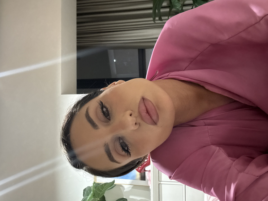 A fair-skinned woman with dark hair and eyelashes is seen from the shoulders up. She faces forward with slightly angled eyes. She wears pink attire, likely a shirt or jacket. Behind her are glimpses of a plant, a window with blinds, and a white cabinet or shelving unit. The background is blurry, suggesting a shallow depth of field. A prominent light beam is visible on the wall behind and to the left.