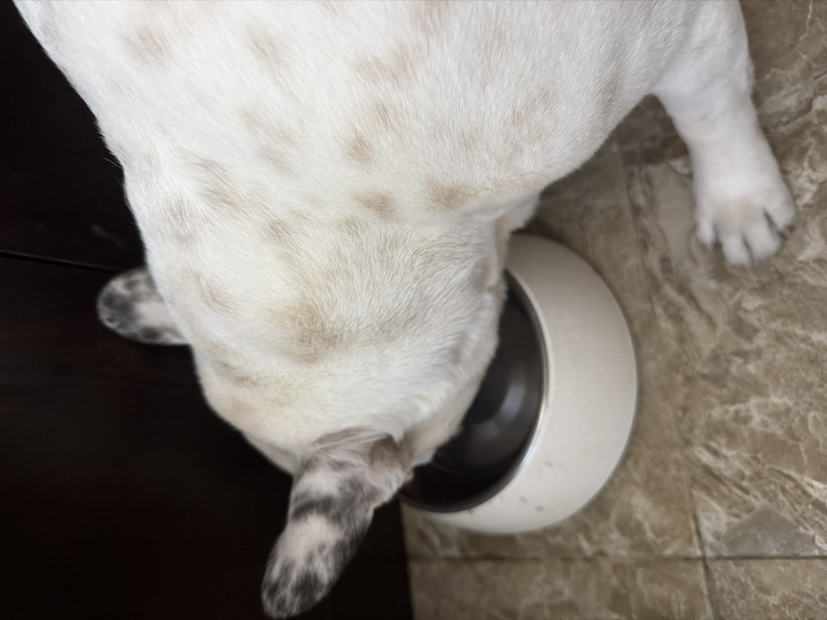An overhead-view forensic image depicts a domestic animal, a dog, engaging in consumption from a pet bowl. The dog exhibits short, white fur marked with numerous light brown to tan speckles or spots across its visible back and head. Its left ear displays distinct grey and black variegated patterning. The animal's head is positioned within a cream-colored, rounded pet bowl featuring a silver-colored interior, indicating the presence of food or water. A portion of the dog's left front leg and paw is visible, resting on a glossy, light brown or beige marble-patterned tiled floor. The background consists of a dark, uniform surface, indicative of furniture or cabinetry. The event is observed within an indoor environment located in Blagoevgrad, Bulgaria.