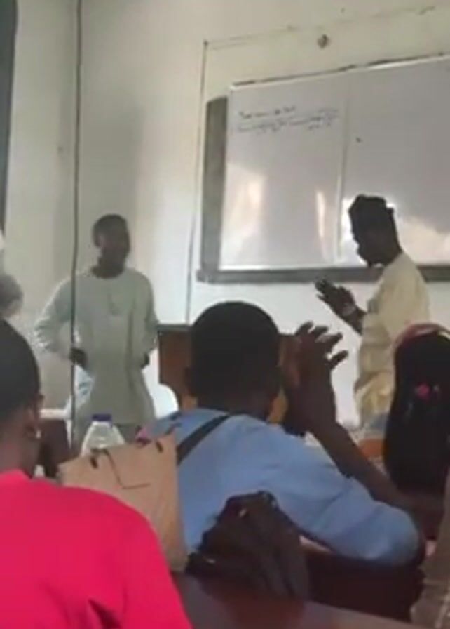 two men speaking to a classroom of students. One man is standing behind a wooden lectern, wearing a light-colored robe. The other man is standing beside the lectern, wearing a similar robe and a dark hat. He appears to be handing something to the man behind the lectern. The students are seated at wooden desks, facing the front of the room. A whiteboard is visible behind the speakers, with writing on it. A cylindrical column is in the corner of the room. The lighting appears to be natural, coming from a window. The students appear to be paying attention to the speakers. The room appears to be a standard classroom setup.