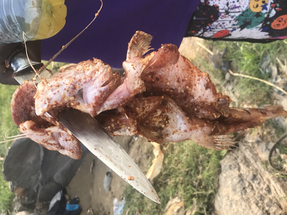Several spiced fish fillets are pierced by a large metal tool. The fish are reddish in color and appear to be seasoned with visible spices. A partially visible clear plastic bottle containing a yellow liquid is present. The background includes purple fabric, colorful patterned fabric, green grass, and a rocky surface. The scene appears to be outdoors.