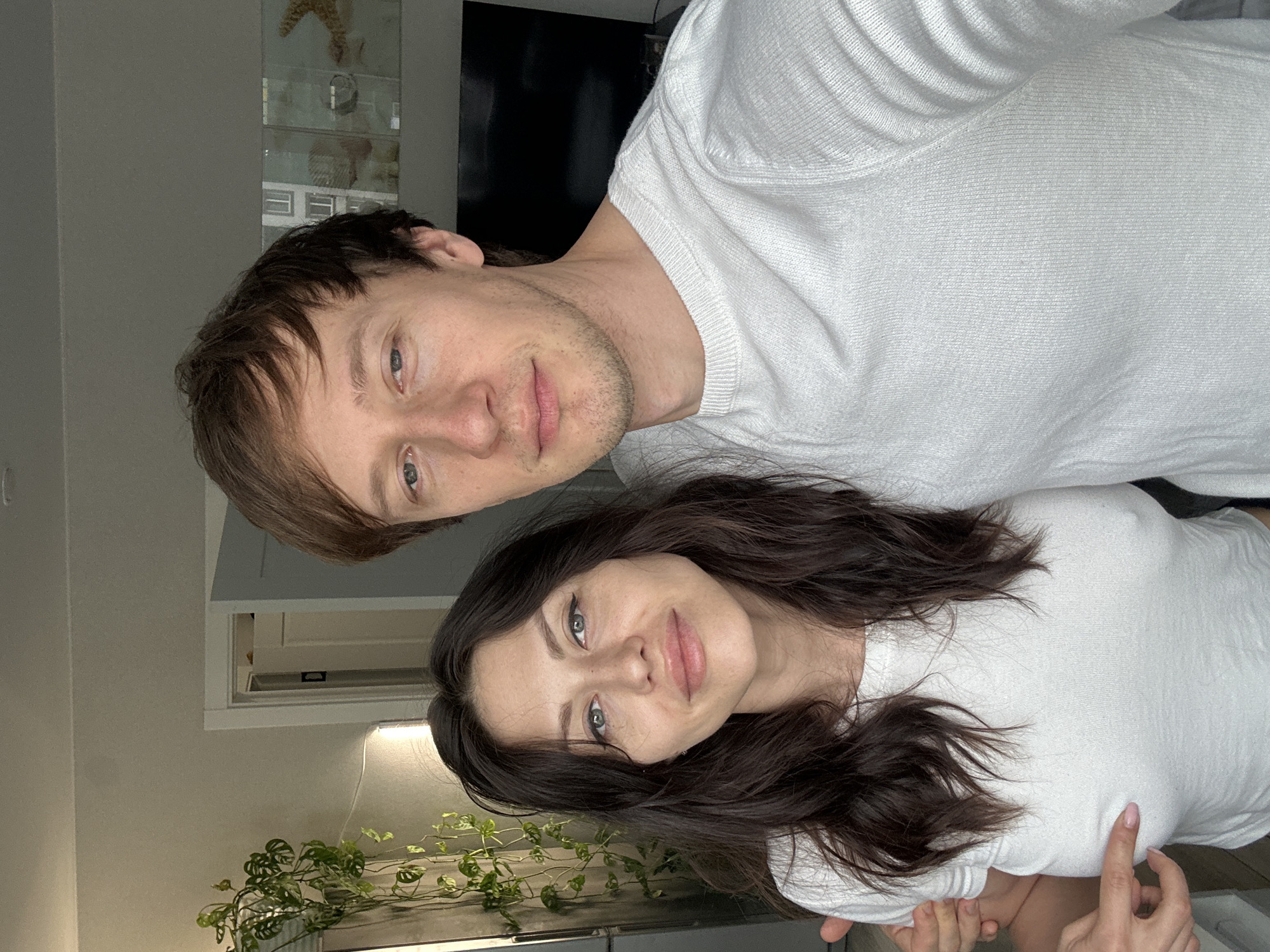An indoor, head-and-shoulders level photograph depicts two individuals, an adult male and an adult female, in what is described as a residence in Murino, Russia. The male, positioned on the right, has short brown hair, light stubble, and wears a white long-sleeved sweater. His left arm is around the female's back. The female, positioned on the left, has long dark hair and wears a tight-fitting white short-sleeved top. Her right hand, with painted fingernails, is extended towards and pointing at her left breast, which is delineated through her top. Her left arm is around the male's back. Both individuals look directly at the camera. The background reveals a domestic interior with light-colored walls. To the left, a large leafy green plant is visible near a vertical light fixture or window, and a partially open white door is present. To the right, a dark flat-screen television is visible, with multi-panel wall art above it, featuring blurred patterns that include a starfish-like form.