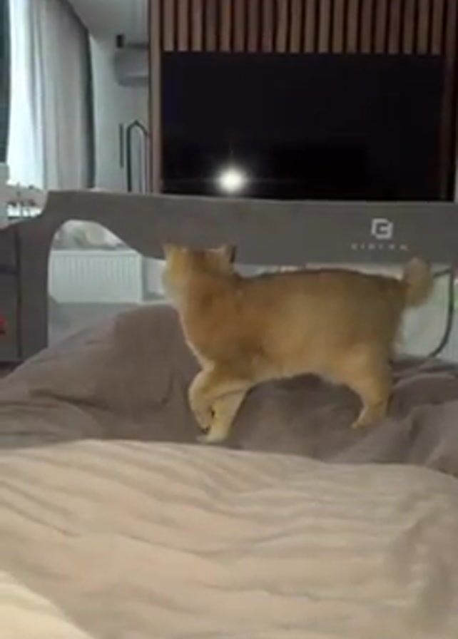 A short video shows a golden cat standing on a bed covered with a gray-brown quilt