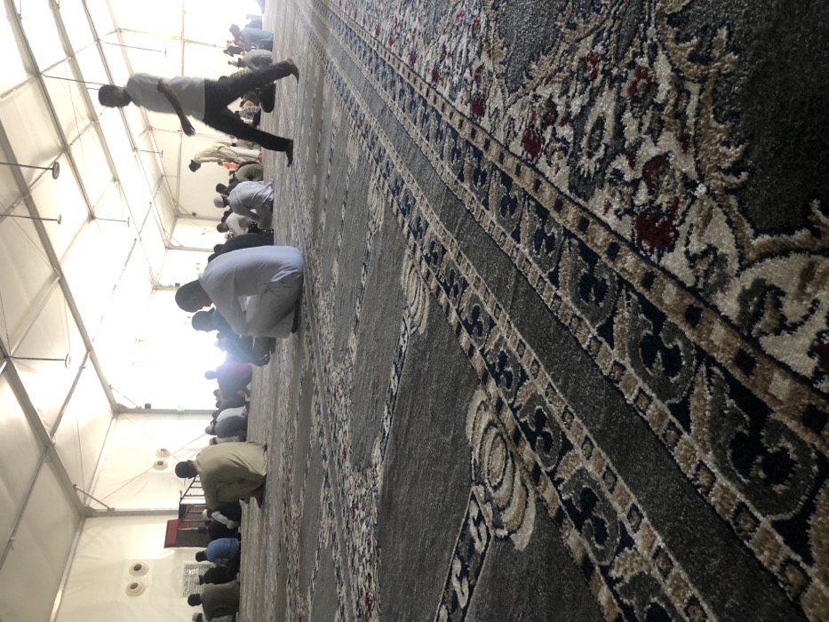 The scene is located in the city of النعيلة, Saudi Arabia, within a large, temporary-looking structure resembling a white event tent with a visible internal metal framework and a high, peaked ceiling. Bright, diffuse natural light illuminates the interior from overhead and the right side, supplemented by ceiling-mounted artificial light fixtures. The floor is entirely covered by patterned prayer carpets in shades of grey, featuring intricate designs in beige, dark blue, black, and accents of maroon. Numerous adult males, estimated at over thirty, are present. Most are seated on the carpet in rows, facing towards the distant left side of the structure, indicative of a communal gathering or prayer. Their attire varies, including traditional long white thobes and more casual shirts with trousers. In the immediate foreground, a man in a light-colored polo shirt and dark trousers is captured mid-stride, walking from right to left across the carpet. To his left, another man in a white thobe is seated on the carpet, facing away from the camera. Further back, a man in a beige thobe is also seated facing left. The seated individuals appear attentive and still. In the distant left background, two circular fixtures are visible on a plain wall, with a darker, slightly raised area suggestive of a mihrab or minbar. No direct interactions between individuals are clearly observed.
