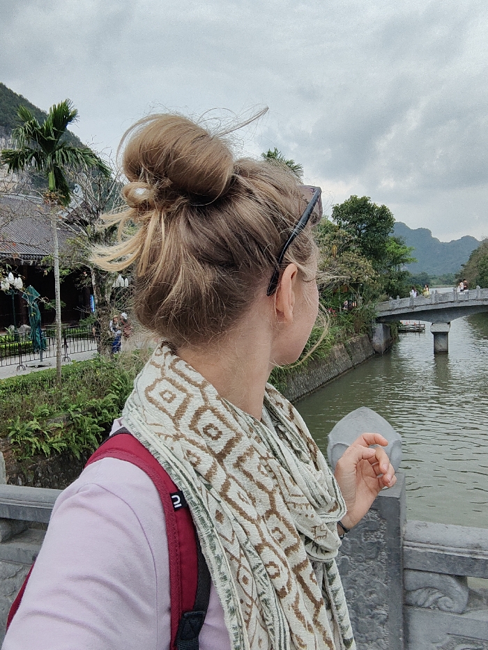 A person is depicted from the back and right side, standing on a stone bridge railing overlooking a canal in Hoa Lư Ward, Vietnam. The individual has blonde hair tied in a messy bun with a white accessory and sunglasses resting on top. They wear a light pink long-sleeved shirt, a beige scarf with a brown geometric pattern, and a red backpack with a black strap displaying a white 'iu' logo. The person's right hand rests on the ornate grey stone railing. To the right, a green-tinged canal flows, bordered by stone walls. In the midground, another multi-arch stone bridge spans the canal, with several indistinct figures crossing it. Beyond the canal and bridges, dense green foliage, trees, and steep, vegetation-covered karst limestone mountains are visible under an overcast sky. To the left of the canal, across a paved area with green plants and a dark fence, traditional-style buildings with dark tiled roofs are present, alongside a tall palm tree and other trees. Multiple distant figures are visible near these buildings.