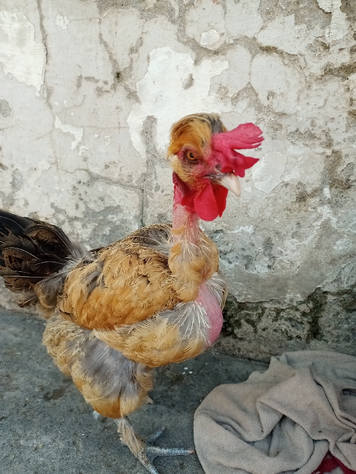 A domestic fowl, possibly a chicken, stands in front of a cracked wall. The bird has a golden-brown body with a mix of dark brown and black feathers on its back. Its neck is bare and red, and it has a prominent red comb. The chicken's face features a sharp beak and intense stare. A light-colored cloth lies on the ground nearby. The background wall has peeling paint and a rough texture.