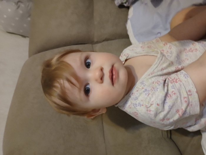 A baby with blonde hair and blue eyes looks up at the camera. The child lies on a tan couch. The baby wears a light-colored top with a floral print. Pillows and bedding are partially visible in the background, suggesting the setting is a home interior.