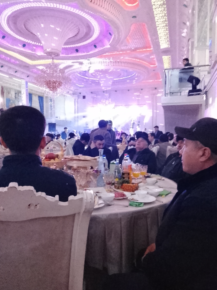 This image depicts an interior view of a large banquet hall located in Khanka, Uzbekistan