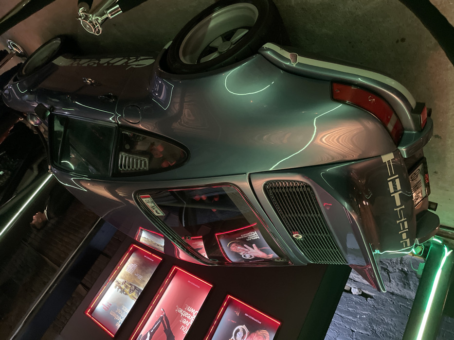 This image captures an indoor exhibition space featuring a classic Porsche vehicle in Mexico City, Mexico