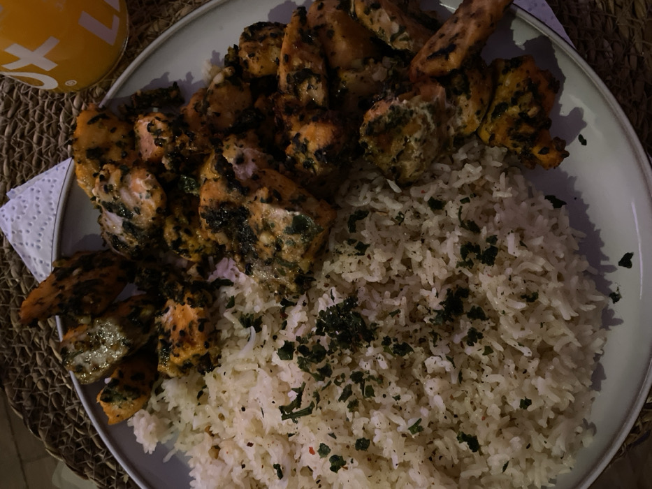 A white plate filled with cooked rice and pieces of grilled chicken. The chicken is seasoned with herbs, and additional herbs are sprinkled on the rice. A beverage in an orange container sits near the plate, partially visible. The plate rests on a woven placemat, and a napkin is positioned to the left of the plate.