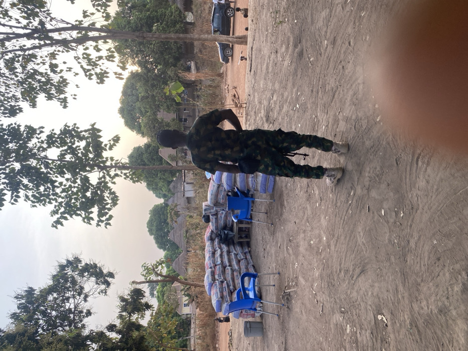A soldier in camouflage fatigues stands guard beside stacks of bagged items and blue plastic chairs. The backdrop features trees with bare branches and a dusty ground surface, suggesting an outdoor setting in a rural environment. Vehicles are visible in the distance, indicating some level of nearby civilization. The overall scene conveys a sense of security and order in the midst of a rustic landscape.