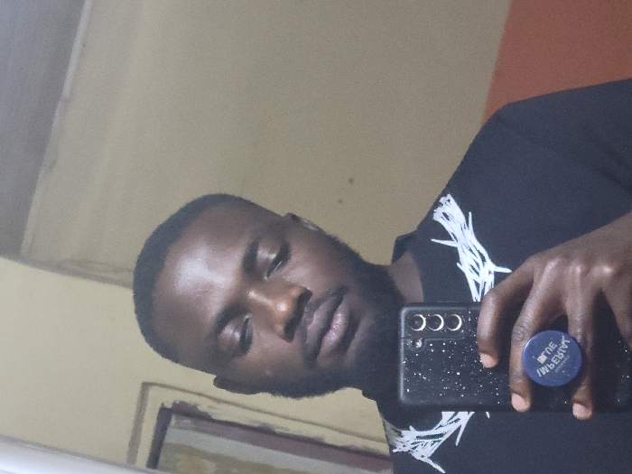 A selfie shows a man with dark hair, a trimmed beard, and brown skin. He is wearing a black shirt with white patterns and holding a dark, speckled smartphone. The phone has a round, blue pop socket on the back. The background is a blend of beige and orange, possibly a wall. The image appears to be taken in a room with overhead lighting.