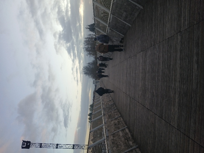 A horizontal shot displays a wooden boardwalk receding into the distance. On either side, metal fences with mesh panels line the pathway. Several figures are walking along the path. The sky is overcast with numerous clouds. A tall metal structure, possibly a crane or tower, stands on the left side of the frame.