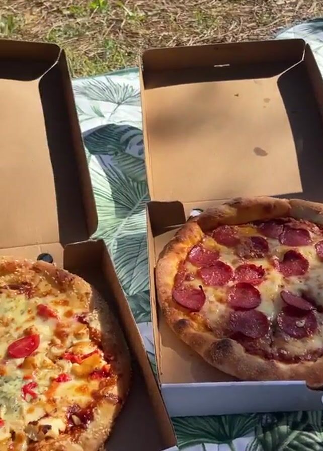 The video opens with a close-up shot of a picnic spread on a green and white leaf-patterned blanket. Two pizza boxes are visible, one containing a pepperoni pizza, and the other with a pizza topped with tomatoes and white cheese. A blue box holds several colorful donuts, and a plastic container contains four chocolate chip cookies. The camera then pans up to show the picnic setting in a grassy field dotted with dry grass and weeds. Tall green trees border the field under a clear blue sky. The video ends showing the vastness of the field and tree line.
