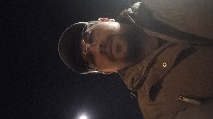 - "A man wearing glasses and a beanie poses against a night sky with a light source, possibly the moon, visible in the distance" by FM-E6cAs1, licensed under CC BY 4.0