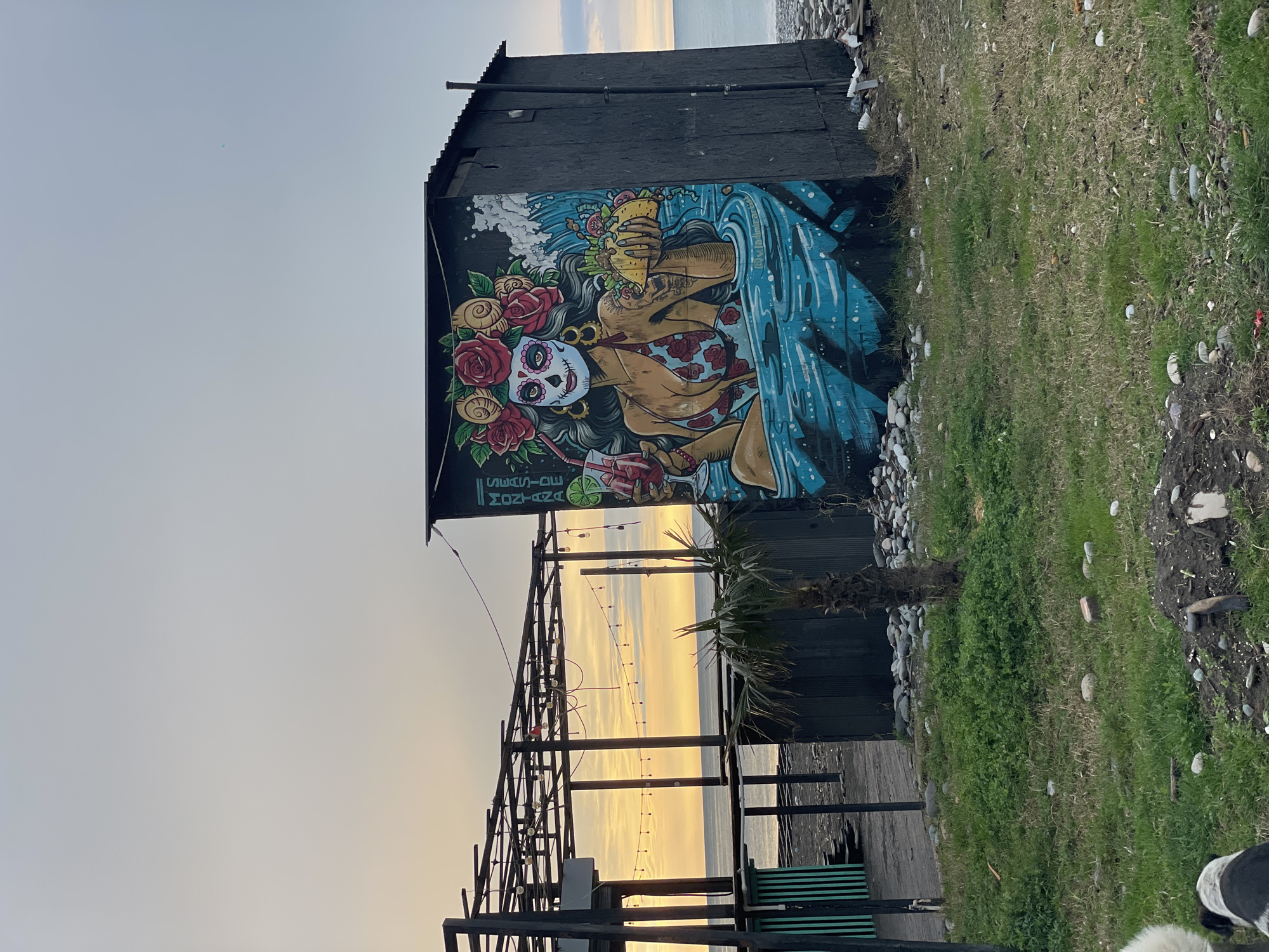 The image depicts an outdoor scene, likely near a beach in Batumi, Georgia, as suggested by the coastal environment and the bar's name. A dark, weathered building stands to the right, adorned with a colorful mural featuring a woman in Day of the Dead-style makeup, surrounded by roses, holding a drink and a piece of food, seemingly bathing in a wave. The mural reads "Seaside Montana." To the left of the building, a metal structure supports string lights, possibly part of a bar or restaurant setup. Beyond this structure, a view of the sea and sunset is visible. The ground is covered in grass and pebbles. In the foreground, there is a glimpse of a dog.