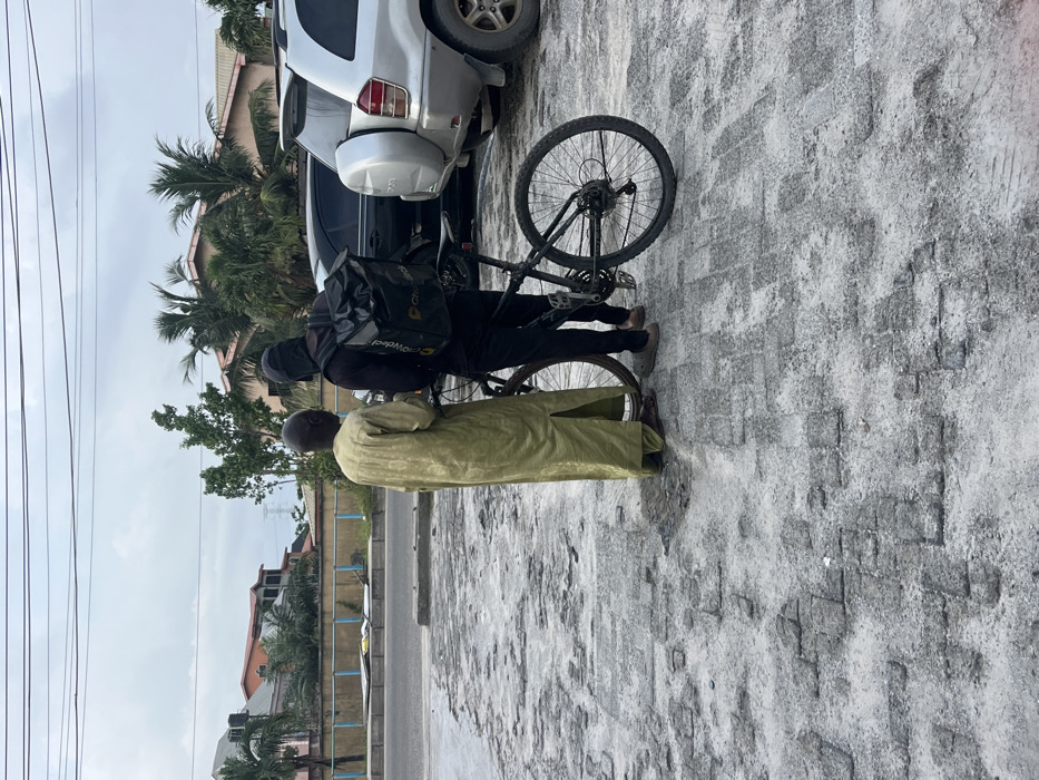 The image depicts an outdoor scene in Badore, Nigeria, featuring two adult males on an uneven, grey paved surface under an overcast sky. The individual on the left, an older male, wears a light green full-length garment and sandals, with his back partially turned to the viewer, facing slightly right. The individual on the right wears dark attire, including a dark hoodie covering their head, dark trousers, and dark shoes; they carry a large black delivery backpack prominently displaying "Chowdeck" and "Coolwadec" logos. A black mountain bicycle with a kickstand is positioned between the two individuals, with the right person standing adjacent to it. In the mid-ground, an asphalt road is visible, separated from the paved foreground by a low, light blue concrete barrier. Beyond the road, two parked SUVs are present: a dark-colored vehicle and a silver SUV with a rear-mounted spare tire. The background includes lush green foliage, featuring several palm trees, and residential-style buildings with light-colored walls and reddish-orange roofs, one featuring a black water tank. Overhead power lines traverse the upper portion of the frame, and a distant high-tension power line tower is visible on the left horizon.