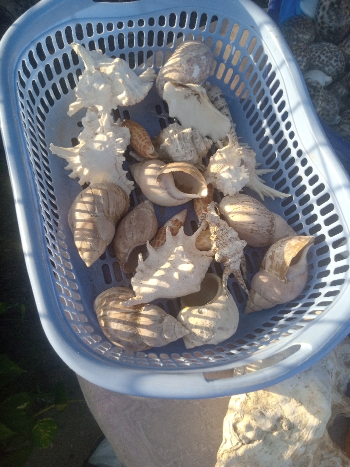 - "The image displays an overhead view of a light blue rectangular plastic basket containing a varied collection of seashells, situated in the Makadara/Mji Wa Kale ward, Kenya" by FM-vsiag2, licensed under CC BY 4.0