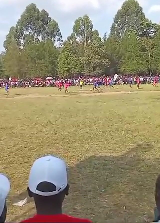 A wide shot shows a soccer game in progress on a grass field surrounded by a large crowd of spectators. The players are wearing blue and pink jerseys. The game is being filmed by a person using a camera on a tripod. Several people are standing in the foreground, watching the game. The trees and buildings in the background suggest the game is taking place in a rural area. The weather is sunny.