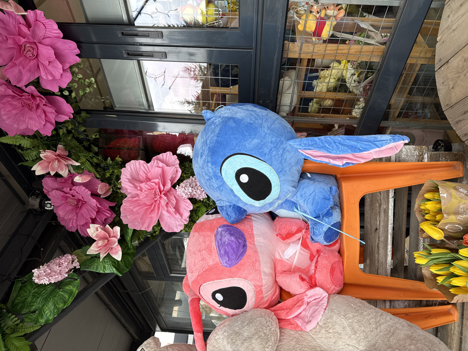 The image displays a vibrant outdoor commercial display, consistent with a shopfront or market stall in an urban setting such as Sofia, Bulgaria. No specific Sofia landmarks are identifiable. The central focus is a pair of large plush toys: a blue "Stitch" character on the right and a pink "Angel" character on the left, both depicted from Disney's Lilo & Stitch franchise. They are seated upright on a bright orange, single-person plastic stool or chair. The "Stitch" toy features prominent black and light blue eyes, while "Angel" has similar features with purple accents around the eyes. To the immediate left of "Angel," a portion of a large, light-colored plush figure, possibly an animal, is visible. In the lower foreground, two brown paper bags are placed on the ground, each filled with numerous fresh yellow tulips, indicating a floral sales point. The bag on the right shows partially legible text, possibly "TULPEN TIN." The orange stool rests on a rough, light-colored wooden surface, possibly pallets or crates, with a darker, uneven ground surface behind it. Above the plush toys, a festive floral decoration hangs from an overhead structure, likely a canopy or building overhang. This decoration consists of several large, intricately folded pink paper or fabric flowers, interspersed with green artificial foliage and smaller, lighter pink decorative elements. A black security camera is mounted on the overhang on the upper left. The background features a multi-paned glass facade with dark grey frames, reflecting diffuse daylight, some distant trees, and possibly power lines, suggesting an outdoor location adjacent to a building. Through the glass, partially obscured by a metal grid, an interior space is visible containing what appear to be bundles of white or cream-colored flowers and additional plush toys, including a small yellow Winnie the Pooh character. To the far right, a segment of a round, light-colored wooden tabletop is visible. The overall scene suggests a retail environment offering flowers and novelty items.