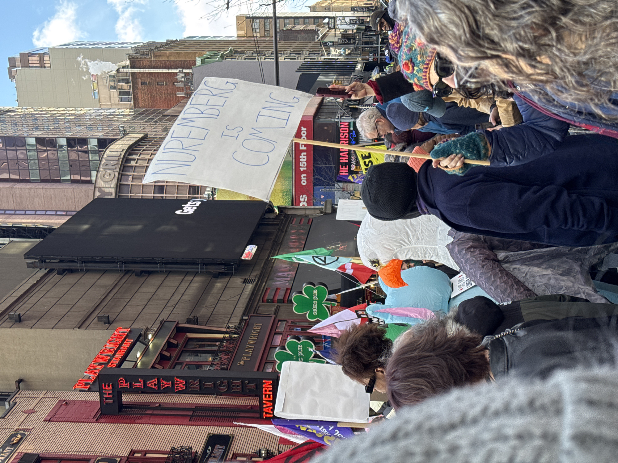 A crowd of people, many holding signs, is gathered in front of "The Playwright Tavern," identifiable by its red neon signage. A large, hand-written sign proclaiming "NUREMBERG IS COMING" is prominently displayed in the center of the image. The building behind it has a sign that says "OS on 15th Floor", and the building next to it has a billboard that reads "HE HARRISON BRASS Bar". A large black billboard advertising "Gets" is also visible. Several Irish-themed decorations and flags are seen. The image captures a street-level view in New York City, with various buildings and signs indicating an urban setting. The gathering appears to be some sort of protest or demonstration.