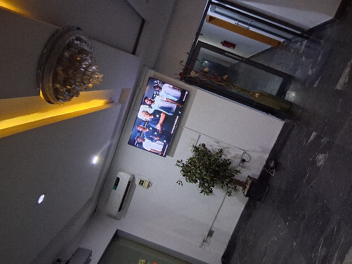 A tilted perspective shows a room with an ornate ceiling light fixture. A flat-screen TV displays several figures. Beneath the TV, an air conditioning unit is mounted on the wall. A potted plant sits on the floor near the wall. A glass-enclosed area with a visible orange bar is located near a dark-tiled floor area. The room's color palette is mainly white, gray, and dark.