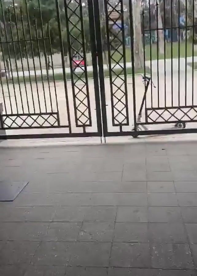 black metal gate with a pattern of vertical bars and diamonds, behind which a scooter is parked. Beyond the gate is a street with pedestrians and cars. The flooring in front of the gate is made of gray tiles. The video is steady and appears to have been taken from a stationary position.