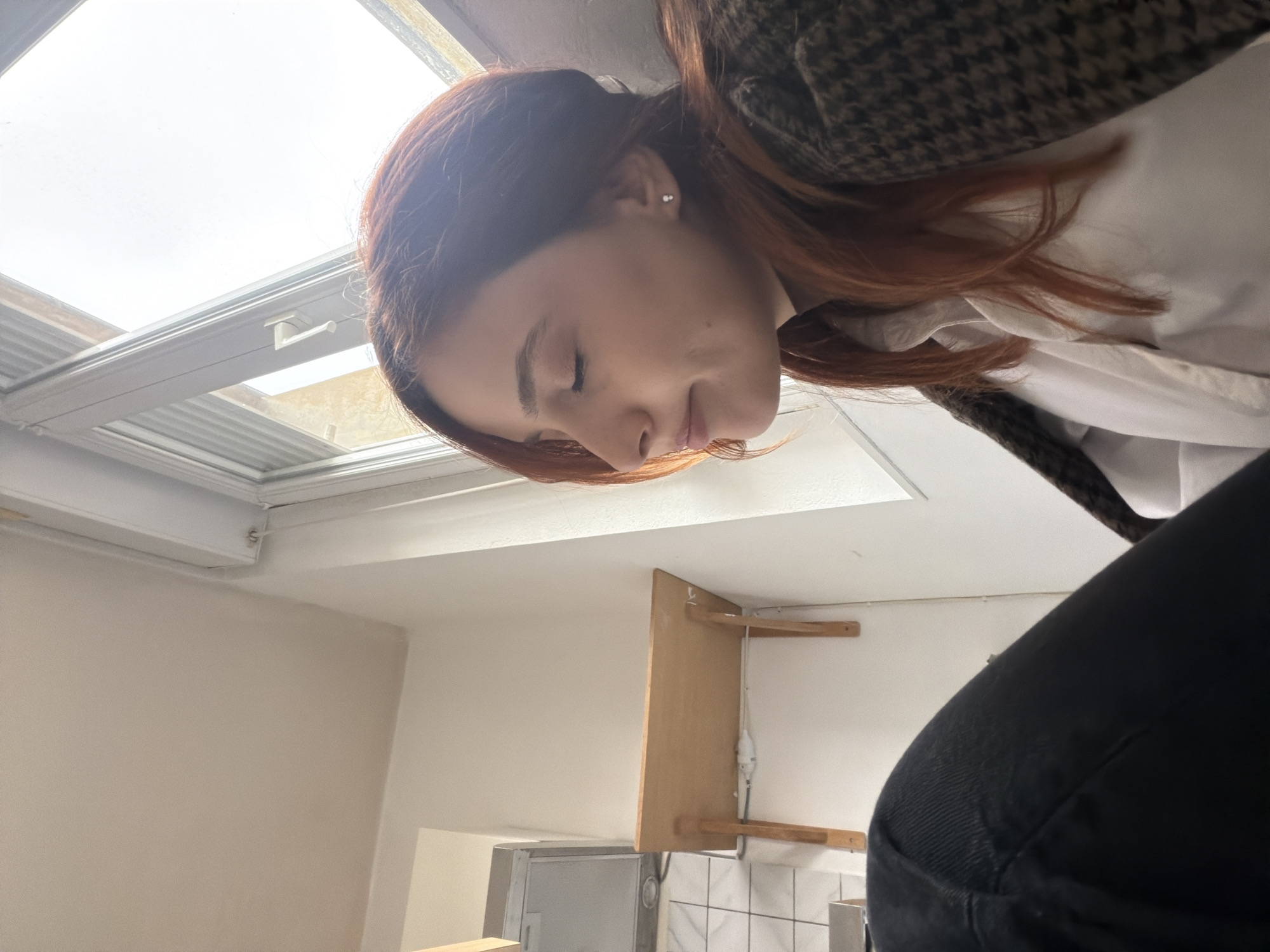 An individual with reddish-brown hair is depicted in an indoor setting in Reims, France. The person is seen in profile, facing left with closed eyes, suggesting a moment of rest or contemplation. They are wearing a white collared shirt beneath a dark-patterned jacket, possibly houndstooth. A small silver-colored stud earring is present in the visible ear. The individual's left leg, clad in dark denim, is partially visible in the lower-left foreground. The background reveals a room with white walls and a light-colored ceiling. A large, white-framed window is on the right, open at the top, allowing bright, overcast natural light to illuminate the scene. To the left, a partial kitchen area is visible, featuring a metallic range hood, white wall tiles, and a light wooden shelf supported by two brackets. An electrical outlet or wiring is visible beneath the shelf.