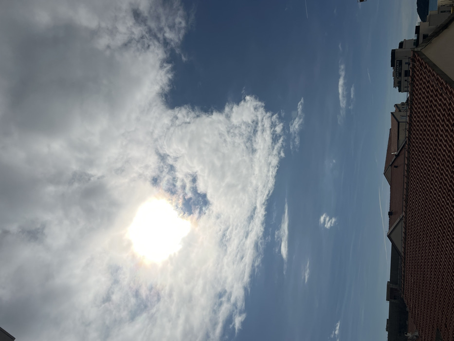 The image displays an overhead view of a partially cloudy sky and rooftops in Rafailovići, Montenegro. The upper-left quadrant features a brilliant, square-shaped solar glare emanating from behind scattered white and light gray clouds, exhibiting a faint diffraction halo. The sky shifts from heavily clouded in the upper-left to clearer blue in the lower-right, traversed by various cloud formations, including dense cumulus and wispy cirrus-like streaks. In the lower third of the frame, several buildings with distinct red terracotta tiled roofs are visible, indicating an urban or semi-urban environment. Further in the distance, lighter-colored multi-story structures are discernible, one of which prominently displays the text "MATAMARE" on its upper façade. A narrow, linear contrail is faintly visible across the blue expanse of the sky in the middle-right section. A sliver of blue water, likely the Adriatic Sea, can be seen on the far right horizon, beyond the buildings. No individuals or specific actions are depicted.
