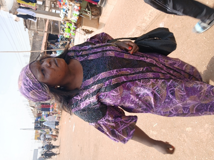 The image displays an outdoor market scene in Heany, Zimbabwe, under bright daylight conditions. The central subject is an adult female with dark skin, wearing a purple patterned headwrap and a loose, long-sleeved dress featuring a complex purple, black, and gold/brown geometric pattern with black sequined or textured fabric on the upper torso and sleeves. A gold-colored hoop earring is visible on her left ear. She carries a black handbag in her right hand, and her fingernails are painted red. Her expression is neutral, and she appears to be looking towards the viewer's right. The ground consists of unpaved, reddish-brown dirt. In the background to the left, blurred figures walk along what appears to be a busy street. To the right, various makeshift market stalls, constructed from wood and corrugated metal, display merchandise including hanging clothing and items on wheeled carts. Overhead power lines are discernible against the bright sky.
