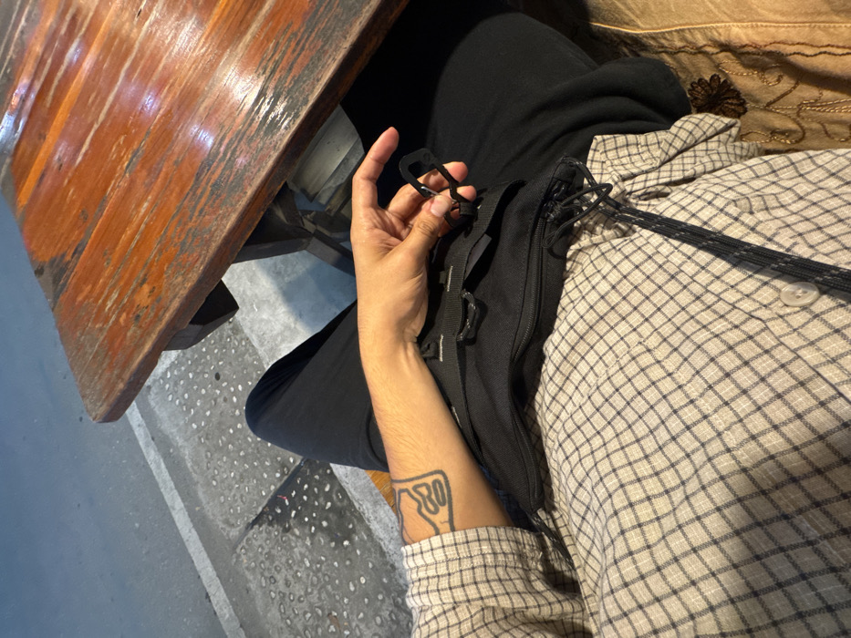 The image depicts a close-up, downward-angled view of a person seated at an outdoor establishment in Pai, Thailand. The subject, a person with a medium-to-dark skin tone, is wearing a light-colored, possibly beige or cream, plaid long-sleeved shirt and black trousers. A linear, abstract tattoo is visible on their right forearm. A black fanny pack or sling bag rests on their lap. The person's right hand is grasping a black, open-ended object, possibly a carabiner or similar accessory, which is attached to the fanny pack. A black braided cord or strap extends from the fanny pack towards the lower right. To the right of the person's leg, a section of gold-colored patterned fabric, possibly upholstery or a cushion, is visible. In the upper right quadrant, a rustic, weathered wooden table with a reddish-brown, discolored surface is prominent. Beyond the table and the person's left leg, a textured concrete or paved sidewalk is visible, featuring a pattern of small, light-colored embedded elements, bordered by a lighter curb and a darker paved surface beyond. The scene is illuminated, suggesting daylight or early evening conditions.