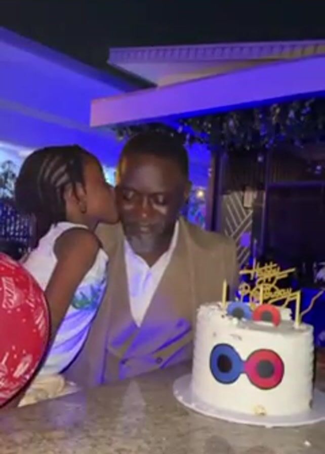 A father and daughter stand in front of a birthday cake. The daughter is a young, dark-skinned girl with braided hair, wearing a white tank top with a blue and green floral pattern. The father is a middle-aged, dark-skinned man with graying hair and a beard, wearing a tan suit jacket and a white shirt. He is looking down at his daughter with a smile. The cake is white, round, and decorated with an image resembling 3D glasses, and it has candles and a "Happy Birthday" sign on top. A red balloon is partially visible to the left of the frame. The background features an outdoor setting with blue lighting and greenery. The daughter is looking at her father and says, "Happy birthday, Daddy".