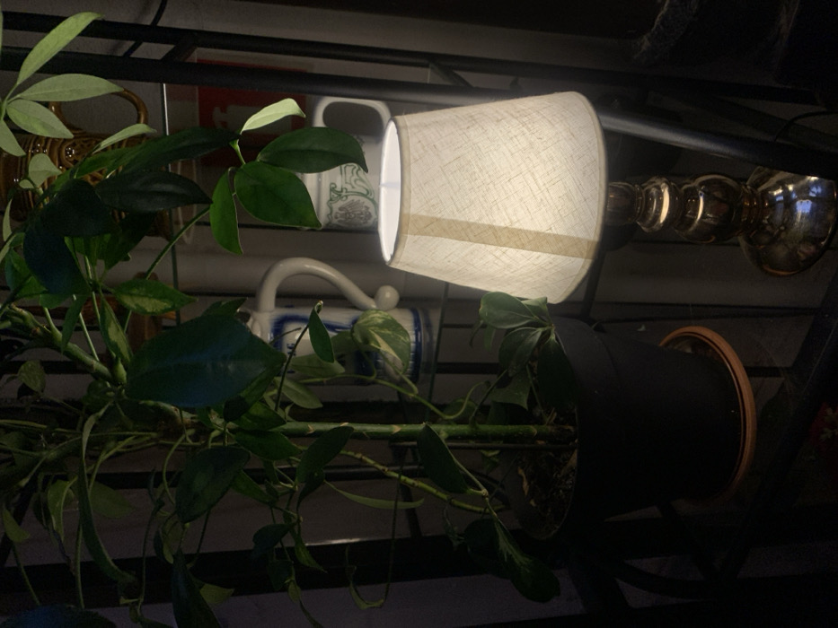 An indoor scene, presumably within a residence or establishment in Krakow, Poland, depicts a static arrangement of objects on a dark-colored metal shelving unit. On the left side, a potted plant, likely a Schefflera, with dark green, palmate leaves, some displaying variegation, is contained in a dark pot resting on a terracotta-colored saucer. To the right, a table lamp with an illuminated, light-colored fabric lampshade, detailed with vertical stripes, emits a warm glow. The lamp's base is reflective, appearing gold or bronze-toned, and features a segmented, decorative design. In the background, on an upper shelf, a white ceramic stein adorned with blue folk-art style patterns holds a small variegated plant. Adjacent to it, a lighter-colored mug with a faint green emblem is visible. A vertical reddish object is dimly discernible on a higher, more distant shelf. No people are present, and no actions or interactions beyond the lamp's illumination are depicted.