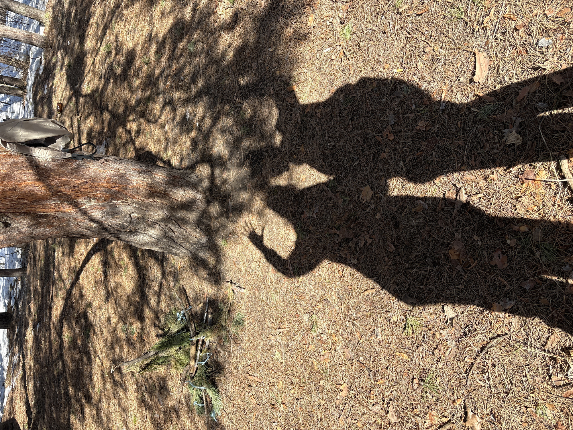 ground-level view in a wooded area near Ulyanovsk, Russia. The ground is covered in pine needles and other natural debris. A tree trunk lies horizontally across the left side of the image, with a backpack resting on it. A small collection of pine branches tied together with blue twine is visible below the trunk. Two shadows are cast onto the ground, appearing to be those of two people. One shadow includes a hand raised in the air, creating a playful interaction between the figures casting the shadows. The location seems to be a park or wooded area possibly near a forest. Patches of snow can be seen in the background suggesting a time after or before winter.