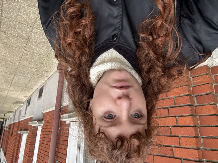 The image displays a female individual in a close-up, head-and-shoulders composition, positioned outdoors in the city of Suresnes, France. The subject has reddish-brown, curly hair with bangs, light-colored eyes, and fair skin, featuring a small gold-toned hoop nose ring on the left nostril. She is dressed in a cream-colored, knitted turtleneck garment beneath a black bomber-style jacket with a ribbed collar and snap closures. The background to the left consists of a reddish-brown brick wall laid in a stretcher bond pattern. To the right, a building facade continues with reddish-brown brickwork, exhibiting white window sills, white trim around window openings, and a vertical reddish-brown drainpipe secured with a white strap. Below the window sills at ground level, rectangular indentations or small window wells are visible. The ground is a light grey, speckled sidewalk extending into the background, indicating a pathway alongside the building. The lighting is even and diffuse, suggesting an overcast day.