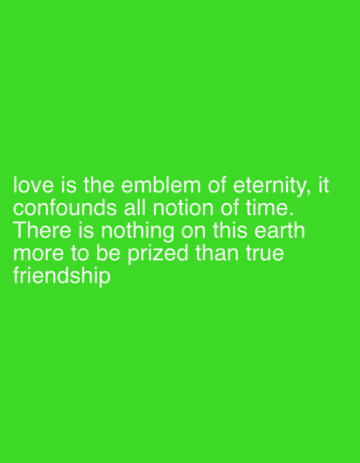 The image displays white text on a solid, bright green background. The text reads: "love is the emblem of eternity, it confounds all notion of time. There is nothing on this earth more to be prized than true friendship". No people, distinct objects, or discernible actions are depicted. The environment is an undifferentiated colored plane. This scene is located in the city of Babawa, Nigeria.