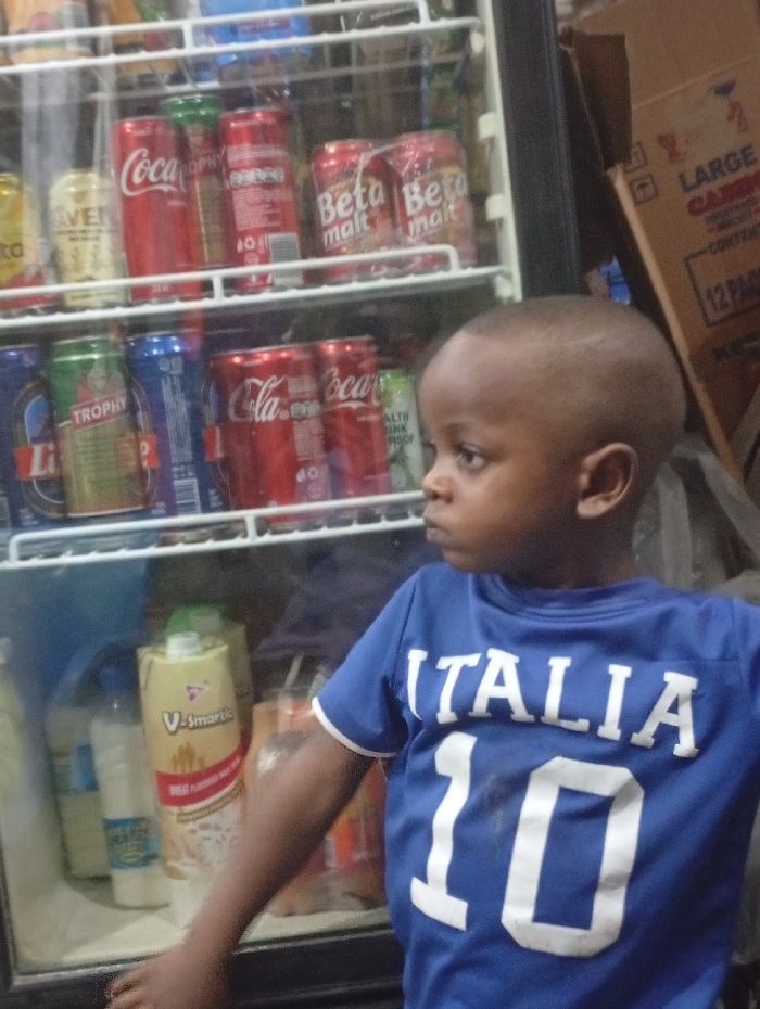 The scene is a retail establishment, likely a convenience store or market stall, located in Onitsha, Nigeria