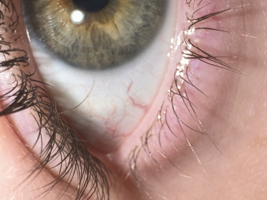 A close-up image showcases a hazel eye, highlighting the intricate patterns of the iris. The pupil is dark and reflects a light source. The surrounding sclera displays visible blood vessels. Dark eyelashes frame both the top and bottom eyelids, with a slight sheen suggesting moisture or product. The skin around the eye has a fair complexion.