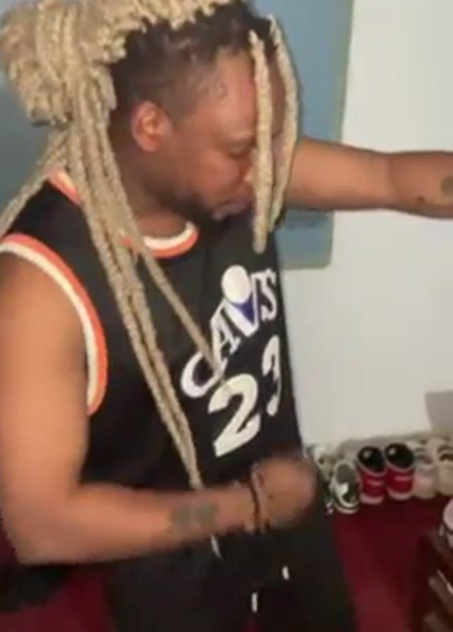 A man is dancing in a room. He is wearing a black Cleveland Cavaliers jersey with the number 23, black pants, and has blond dreadlocks piled on top of his head. He has a wristband on his left wrist. The walls are painted a light blue. A row of shoes is on the floor against the wall behind him. He is looking down and making small dance moves.