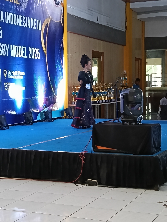 A woman in an elaborate, dark gown with red trim stands on a blue stage at the SBY Model 2025 event, indicated by a blue banner. She wears gloves and has her hair styled up. Behind her, a table displays numerous trophies. A stage light stands on a table covered with a black cloth, and a red cable runs across the floor. People can be seen in the background, near doorways and windows. The floor is tiled with white tiles.