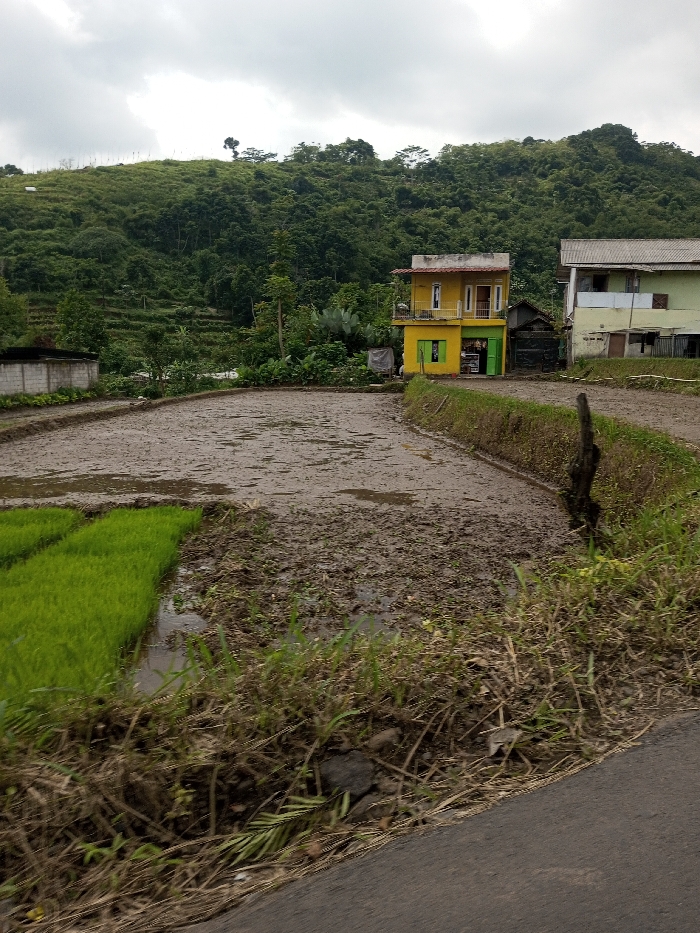 The image displays a rural landscape in Cibodas, Indonesia, under an overcast sky. The scene is dominated by a large rice paddy field. The majority of the paddy consists of wet, dark brown mud with visible clumps and standing water. In the lower-left portion, a section of the paddy features vibrant green rice shoots partially submerged in water, indicating recent planting. Two multi-story buildings are situated on the far side of the paddy, at the base of a densely forested hill. The prominent building on the left is two-storied, primarily yellow, with a light-colored balcony and window frames on the upper level and a green storefront on the ground floor. To its right, a second two-story building with light green upper walls is partially visible. A steep hill, covered in dense, dark green foliage and displaying terraced patterns on its lower slopes, forms the background. A low, white concrete wall borders the paddy on the far left. The immediate foreground on the right reveals a dark gray asphalt surface, consistent with a road, partially obscured by dry grasses and sparse green vegetation along the edge of the paddy field. No individuals or active interactions are depicted.