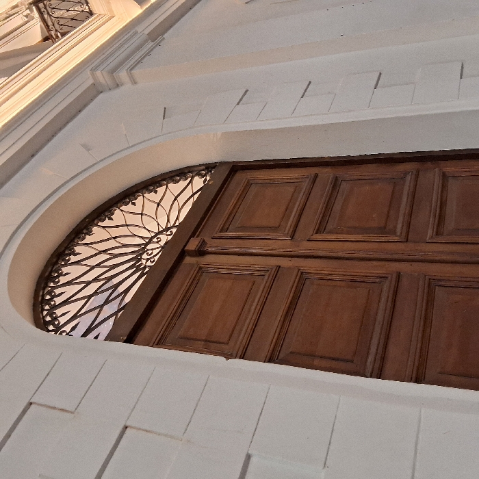 - "The image depicts a low-angle view of a substantial dark brown wooden double door set within a white arched entryway in San Fernando del Valle de Catamarca, Argentina" by FM-6OP392, licensed under CC BY 4.0