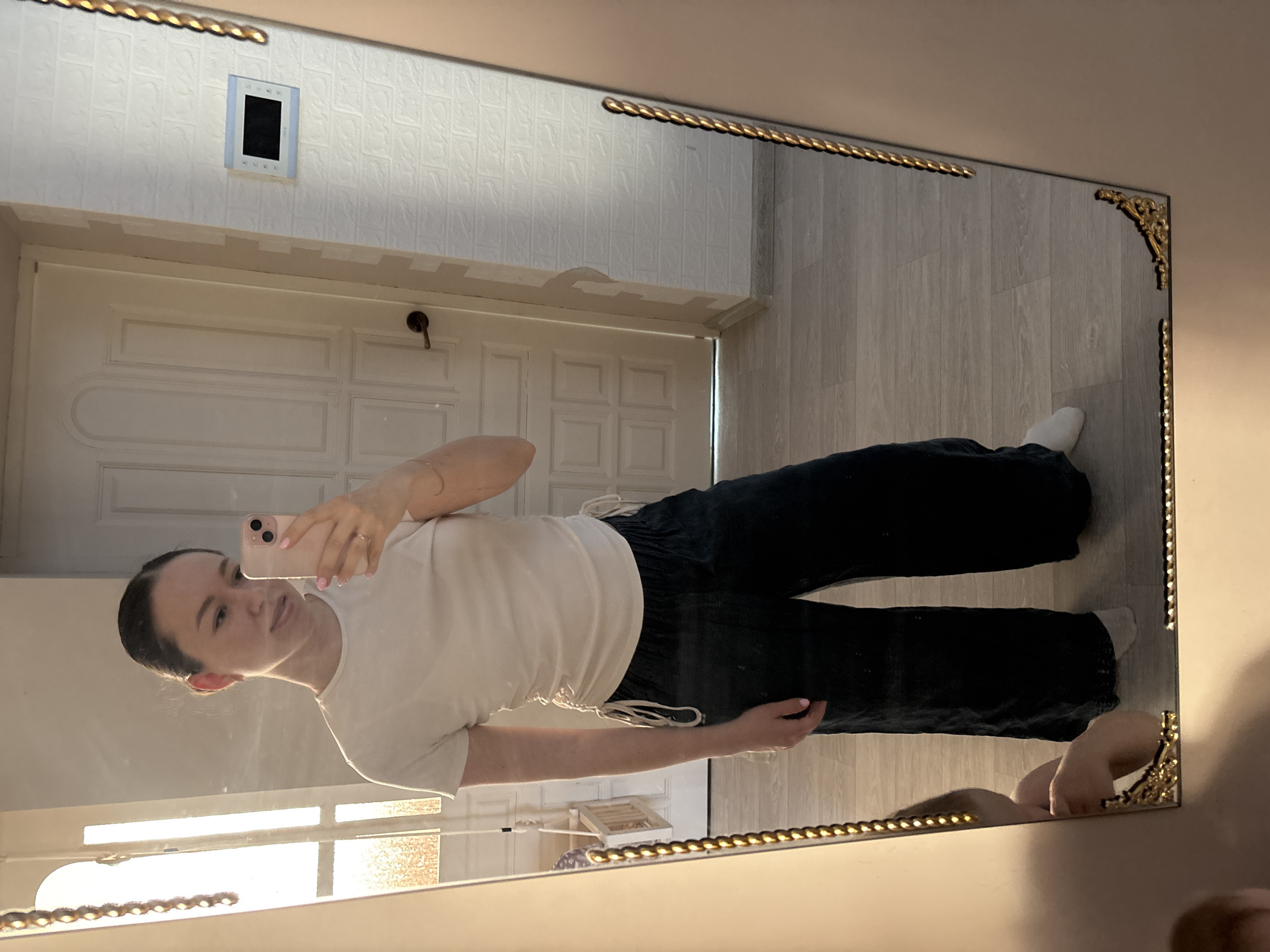 A woman in a white shirt and dark pants takes a mirror selfie in a room. The room has a white door with a video intercom. The city, Ферма, Russia, cannot be confirmed.