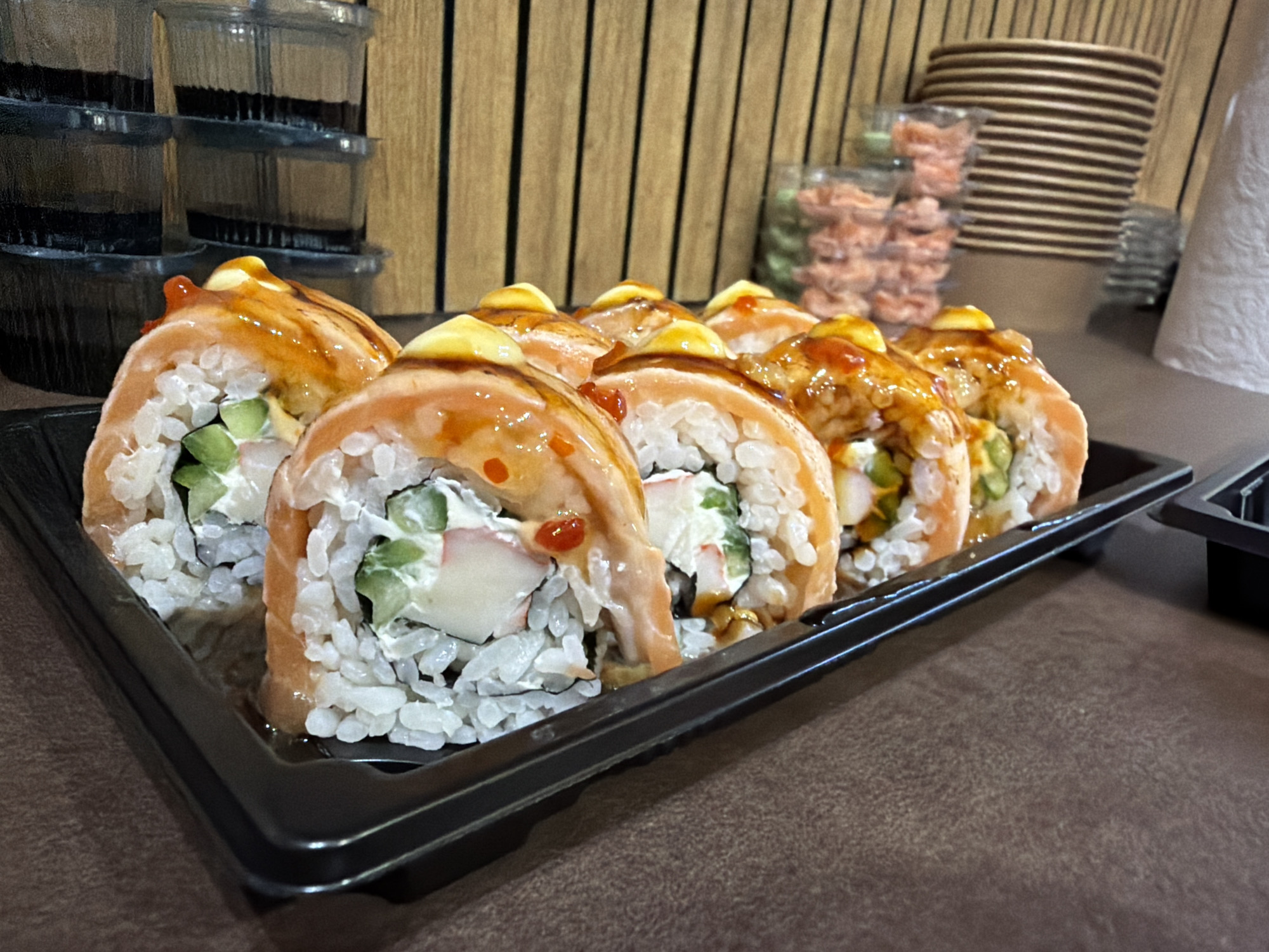 A black plastic tray holds eight pieces of sushi rolls. The sushi consists of white rice, imitation crab, cucumber, and a cream cheese filling, wrapped in a slice of salmon. The salmon is topped with a sauce, likely a spicy mayonnaise or teriyaki glaze. The tray is placed on a brown surface. The background features stacked plastic containers, a stack of plates, and containers of ginger. The location is likely a restaurant or take-away sushi establishment, possibly in Pleven, Bulgaria, although this cannot be definitively confirmed from the image alone.