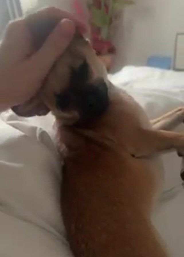 A person is petting a small, brown dog that is lying on a white bed. The dog has black markings on its face. A vase with sunflowers is visible in the background. The person's hand is visible, gently stroking the dog's head.